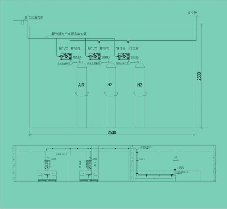 實驗室用氣主要有不燃氣體(氮氣、二氧化碳)、惰性氣體(氬氣,氦氣等)、易燃氣體(氫氣、一氧化碳)、劇毒氣體〔氟氣、氯氣)及助燃氣體(氧氣)組成,可以通過輸氣管接到各實驗室內,一般氣相室配置氦氣(He)、氮氣(N2)。氣質聯用室配置氮氣,氯氣、氧氣。所有管線在安裝完畢后一定要做氣密性實驗,嚴禁有泄露的可能。由于管道細小,管間距小,安裝過程中可依據現場情況進行凋整,氣瓶裝柜時,易燃易爆與惰性氣體同柜,杜絕兩種易燃氣體氣瓶同柜。